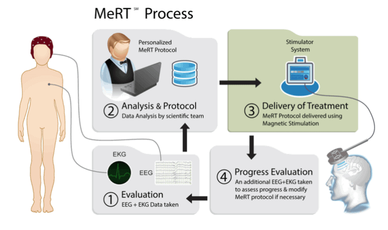 What Dr. Won described is a non-pharmaceutical, non-invasive technology called Magnetic e-Resonance Therapy (MeRT), which “uses brainwave analysis to construct an image of neuronal communication activity.” The brain mapping technology allows the team to provide a personalized protocol for “non-invasive neuromodulation.”