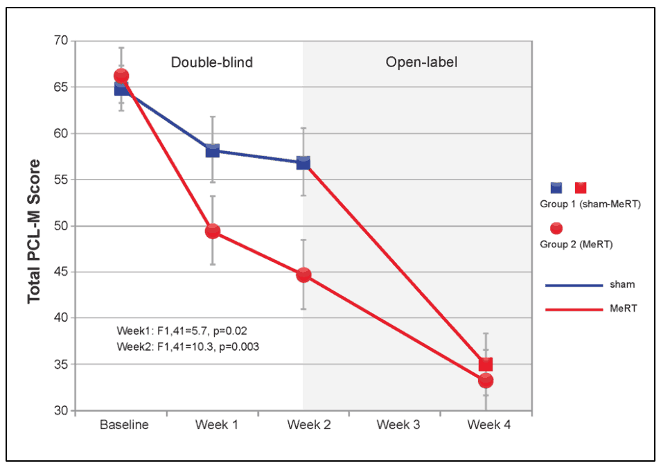 This data was presented at the American Association of Neurological Surgeons (AANS) and the Society for Brain Mapping and Therapeutics (SBMT). You could clearly see the point where the placebo group started to receive the real treatment as well (Group 1: where the blue line becomes red…lower PCL-M scores represents less PTSD symptoms), and they too began to see drastic improvements in their quality of life. Very cool!